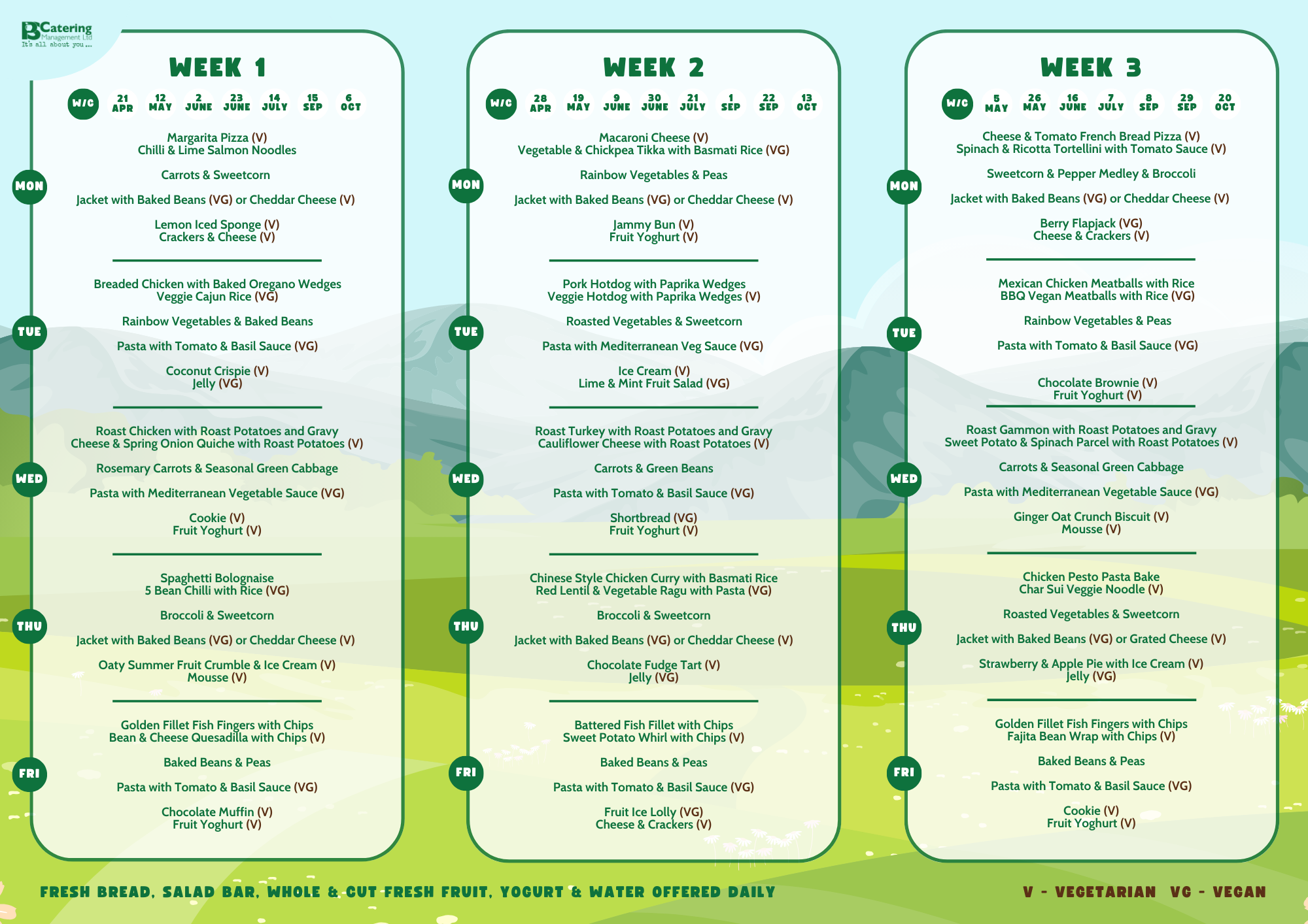 At Brookwood we believe that a healthy balanced diet plays a huge part in our children's ability to arrive in the classroom ready to learn. Our caterers, PS Catering Management, provide a varied menu each week including a salad bar. The current is menu is available to download at the bottom of this page. Please choose your school dinners using the Arbor portal/app under Meals. Please refer to Arbor Help for further information.
